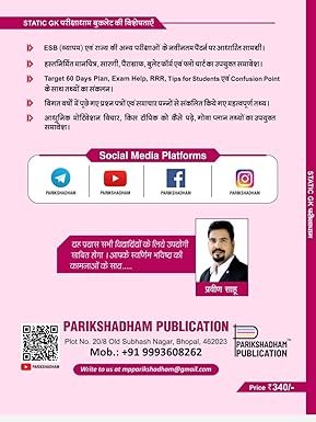 Prepare effectively for Madhya Pradesh government recruitment exams with Parikshadham’s comprehensive Static GK guide. This meticulously crafted study material follows a strategic 60-day preparation plan, covering essential topics for ESB (Vyapam), MPSI, Patwari, Police, Forest Guard, Jail Warden, Teacher recruitment and other state-level examinations. The book encompasses vital subjects including Geography, History, Polity, Economy, Science, and MP-specific General Knowledge, presented through detailed charts, tables, and practice questions. Features latest exam patterns and includes important facts gathered from previous year papers and current affairs. The content is structured with modern pedagogical approaches, making complex topics easily digestible. Priced at ₹340, this Hindi-medium guide serves as a one-stop solution for aspirants preparing for various MP state government recruitment examinations. The book includes handcrafted diagrams and bullet points for better retention and quick revision. Key Features (Bullet Points) Target 60 Days Plan: Structured study schedule to complete the entire Static GK syllabus in just 60 days — ideal for MPPSC, MPSI, and other Madhya Pradesh state exams. Comprehensive Coverage: Includes Geography, History, Polity, Economy, Science, Various Topics, and Madhya Pradesh GK – all in one book. Latest Edition 2025–26: Updated facts and topics based on recent ESB (Vyapam) and MPPSC examinations. Exam-Oriented Format: Topic-wise segmentation and page references help students study efficiently and revise quickly before exams. Perfect for Self-Study: Designed for aspirants of police, patwari, forest guard, teacher selection, and group competitive exams.